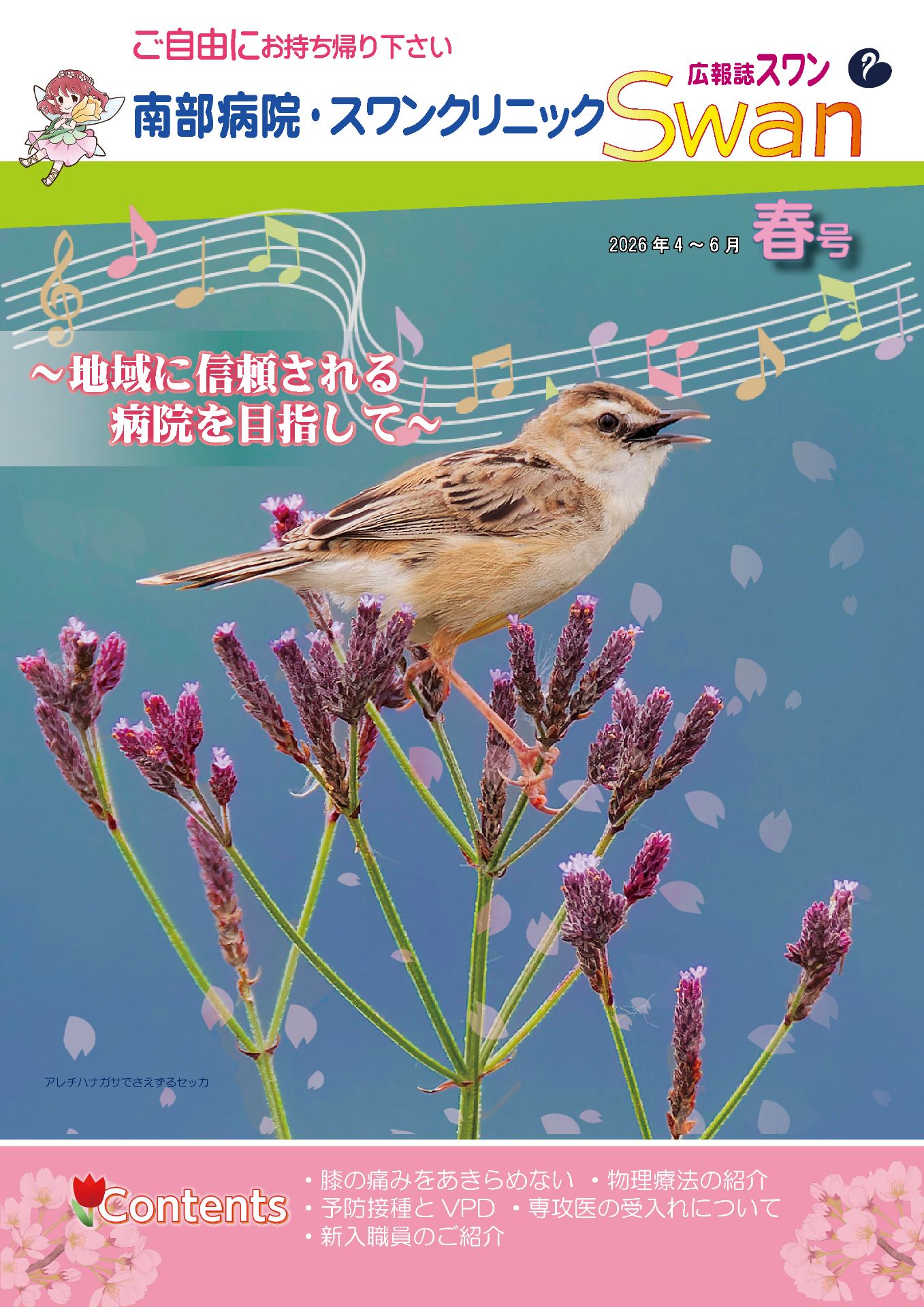 2026年4月春号 ・膝の痛みをあきらめない ・物理療法の紹介 ・予防接種とVPD ・専攻医の受入れについて ・新入職員のご紹介 2026年1月冬号 ・新年のご挨拶 ・病院機能評価 ・全日本病院学会 ・栄養科だより ・クリニカルクラークシップ ・研修医 2025年10月秋号 ・白癬(爪の水虫) ・小児科だより ・医療実習 ・インスタグラムはじめました ・クリニカルクラークシップ ・インフルエンザ予防接種 ・新型コロナワクチン接種 2025年7月夏号 ・熱中症予防のために ・夏に流行する感染症 ・医学生の臨床実習 ・勉強会 優秀発表のご紹介 ・アジサイのヨーグルトゼリー ・確認しよう 蜂の巣 ・避難訓練 2025年4月春号 ・膝痛の新しい治療法 末梢神経ラジオ波焼灼療法(クーリーフ) ・食物アレルギーについて ・栄養科「玉ねぎのレモンマリネ」 ・三浦一朗医師講演 ・急変時の対応勉強会 ・新入職員のご紹介 ・医学生臨床実習受入について 2025年1月冬号 ・新年のご挨拶 ・特集 ~人生100年時代を健康に過ごす~ 慢性的な体調不良を改善 血液をサラサラにする治療、セルフケアについて ・弘前大学医学部医学科 クリニカルクラークシップ ・ごちゃまぜ研修 ・水害を想定した避難訓練 2024年10月秋号 ・甲状腺のお話 ・インフルエンザ予防接種 ・新型コロナワクチン予防接種 ・全日本病院学会in京都 ・弘前大学医学部医学科クリニカルクラークシップ ・中高生、専門・大学生 医療実習 2024年7月夏号 ・小児アレルギーエデュケーターの資格を習得しました ・2024年度弘前大学医学部医学科クリニカルクラークシップ受入れについて ・キュウリとツナのさっぱりそうめん ・避難訓練 ・医療機関の受診はマイナ保険証で 2024年4月春号 ・予防したい骨粗鬆症 ・おいしく食べて骨粗鬆症を予防しよう! ・地域連携室だより レスパイト入院はじめました ・院内研修の取り組み ・職員募集 ・看護奨学生募集 2024年1月冬号 ・南部病院50周年、スワンクリニック5周年特集 PREV1 (このページ)2NEXT